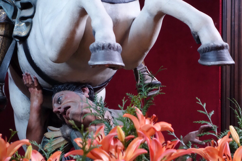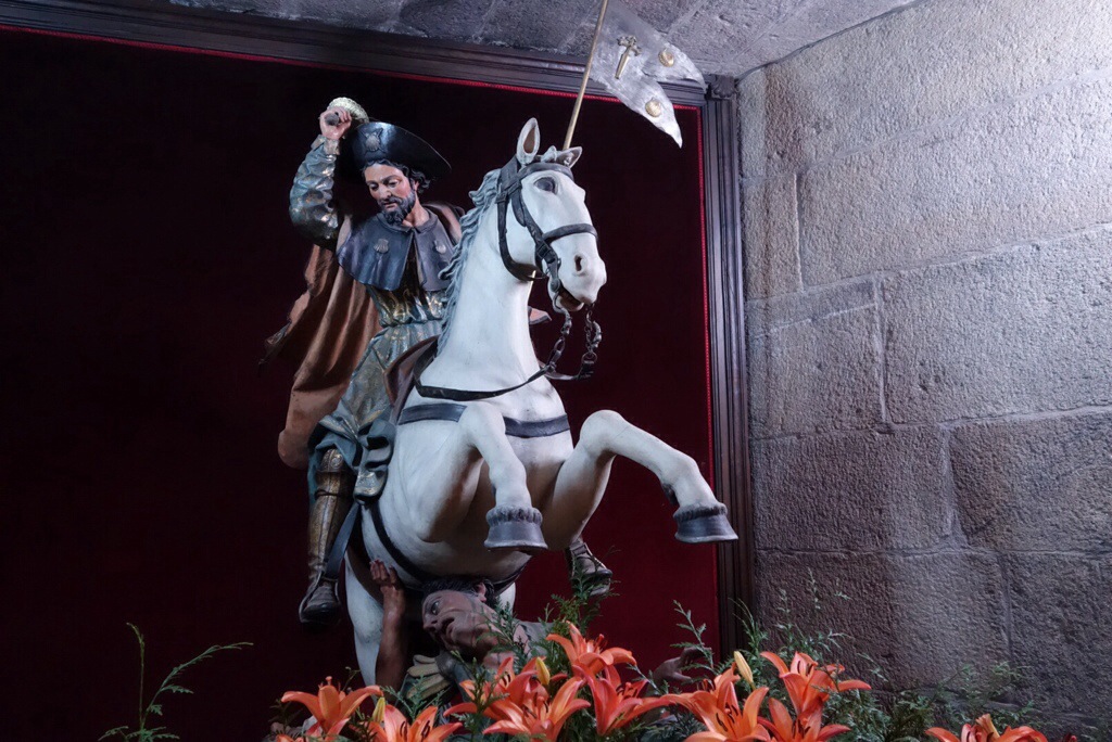So if I had been a Muslim when I dipped my feet into the water of a former mosque upon whose ruins a great church has been constructed, would I have been makings a symbolic challenge to the Reconquista, a small retaking of place lost so long ago? Or had I, even though a Christian, simply touched a wound still sensitive, still unhealed? I’ll never know for sure. The whole incident may have been nothing more than a matter of manners: they just don’t like bare feet on church grounds! But having seen countless paintings and sculptures of Santiago Matamoros (“St. James the Moor-slayer”) in churches along the Camino de Santiago, I do wonder about the lingering significance of images which define cultural or religious identity at the expense of the “other.” All those depictions of Santiago as warrior were put up long ago, of course. At the cathedral of Santiago de Compostela, they have attempted to hide the trampled Muslims behind big flowers, hoping to soften the disturbing iconography. Nevertheless, though I claim no expertise on Spanish history and identity, I did get a sense of something deep and unresolved in that official’s question at the fountain.
