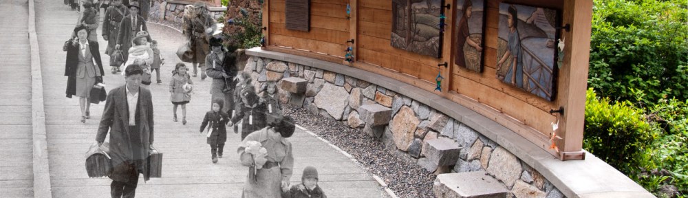 [7]My photos of the story wall are used throughout this post. Thanks to Steven Gardner and Johnpaul Jones for their exquisite artistry, and to Paul Dunn and Tracy Matsue Loeffelholz for their composite image of the wall and the historic photo of the evacuees walking toward the ferry.