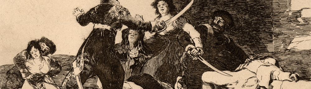 Goya’s war images convey this truth. They grant no wider picture of strategy or purpose, but only offer snapshots of an ambient violence, which seems to exist independently of the anonymous actors caught up in war’s depersonalizing horror. “What courage!” reads the artist’s caption, “Que Valor!” Was Goya being ironic? One might interpret this etching as an image of resistance—a brave woman standing on the bodies of her fallen comrades to reach the cannon’s fuse and repel the oppressors. But I can’t help seeing a pile of indistinguishable corpses, and a faceless figure whose own subjection to the laws of force has but one future.