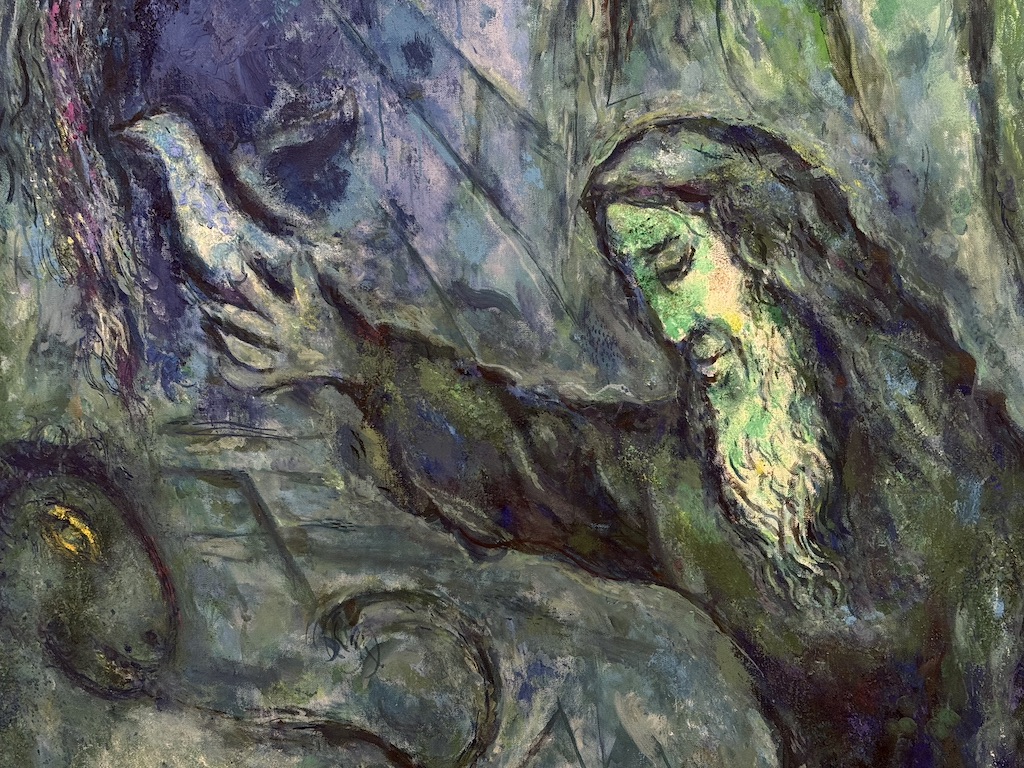 Marc Chagall, Noah’s Ark (detail), 1961-1966. Artists have typically painted the ark from outside, tossed by an angry sea. But Chagall shows the ark’s interior as an aquatic womb where hope is biirthed amid the storm. His head bent in prayer, Noah sends forth the dove as a sign of enduring faith and living hope.