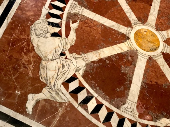 I recently photographed the 16th-century pavement image of Fortune’s wheel in the cathedral of Siena in Italy. There are 4 figures riding the wheel; one at the top, one at the bottom, one going down, and one riding upward. I chose the latter for this post as sign of hope.
