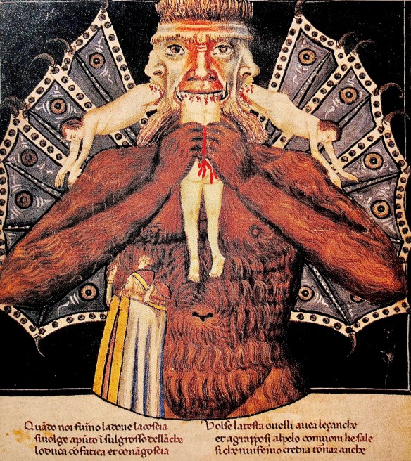 And what does Dante find at hell’s deepest core? He finds Lucifer, or what is left of him, forever stuck in ice of his own making (the bitter wind generated by his flapping batwings freezes the outflow of infernal rivers). His single head has three faces, each with a different sickly hue. The mouth of each face chews without swallowing the body of a notorious traitor. Everything about him is a wretched parody of the Divine. The three faces parody the Trinity, the freezing wind parodies the life-giving breath of the Holy Spirit, the eternal chewing parodies the eucharist.
