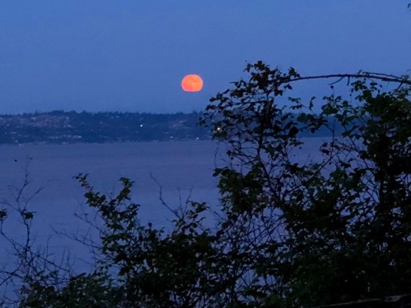 The most recent full moon rises over Puget Sound on the Fourth of July.